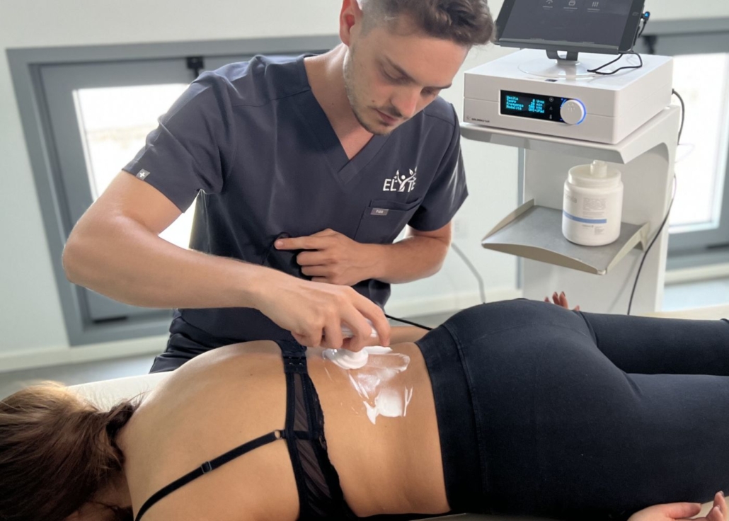 Il terapista selezionerà la zona da trattare, quella dolorosa o legata alla patologia,  e applicherà una crema conduttrice sui tessuti per consentire una migliore penetrazione dell’energia applicata e un migliore scorrimento sui tessuti.